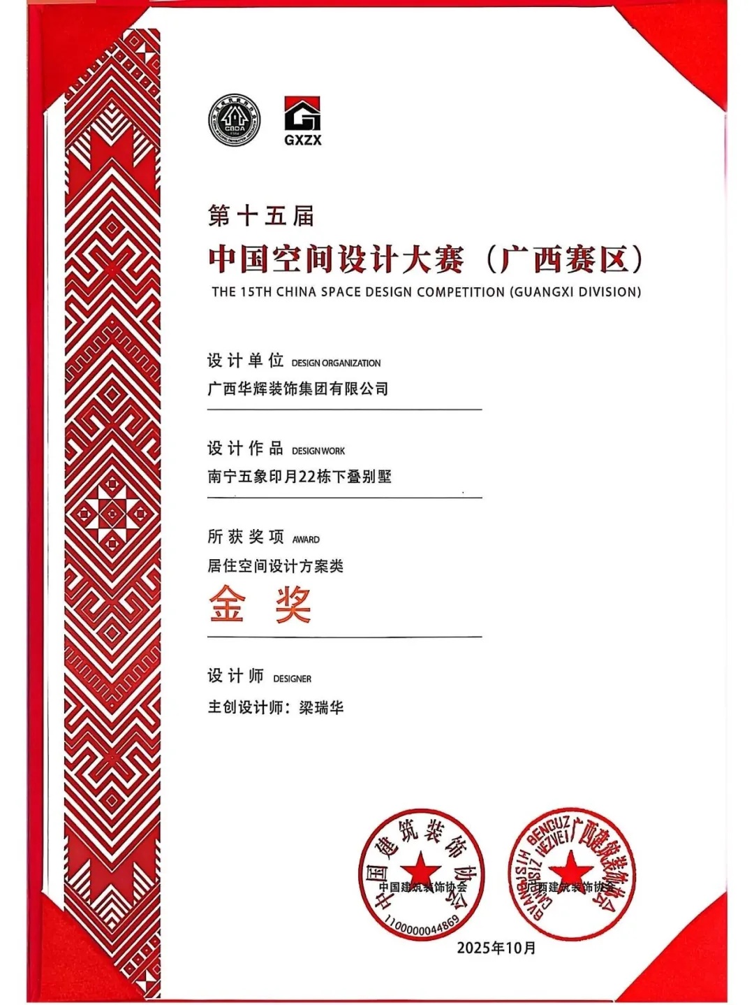 2025年11月12日,由广西建筑装饰协会主办、广西建筑装饰协会设计分会承办、广西华蓝建筑装饰工程有限公司协办的第十五届中国空间设计大赛广西赛区典礼活动在南宁顺利举办。