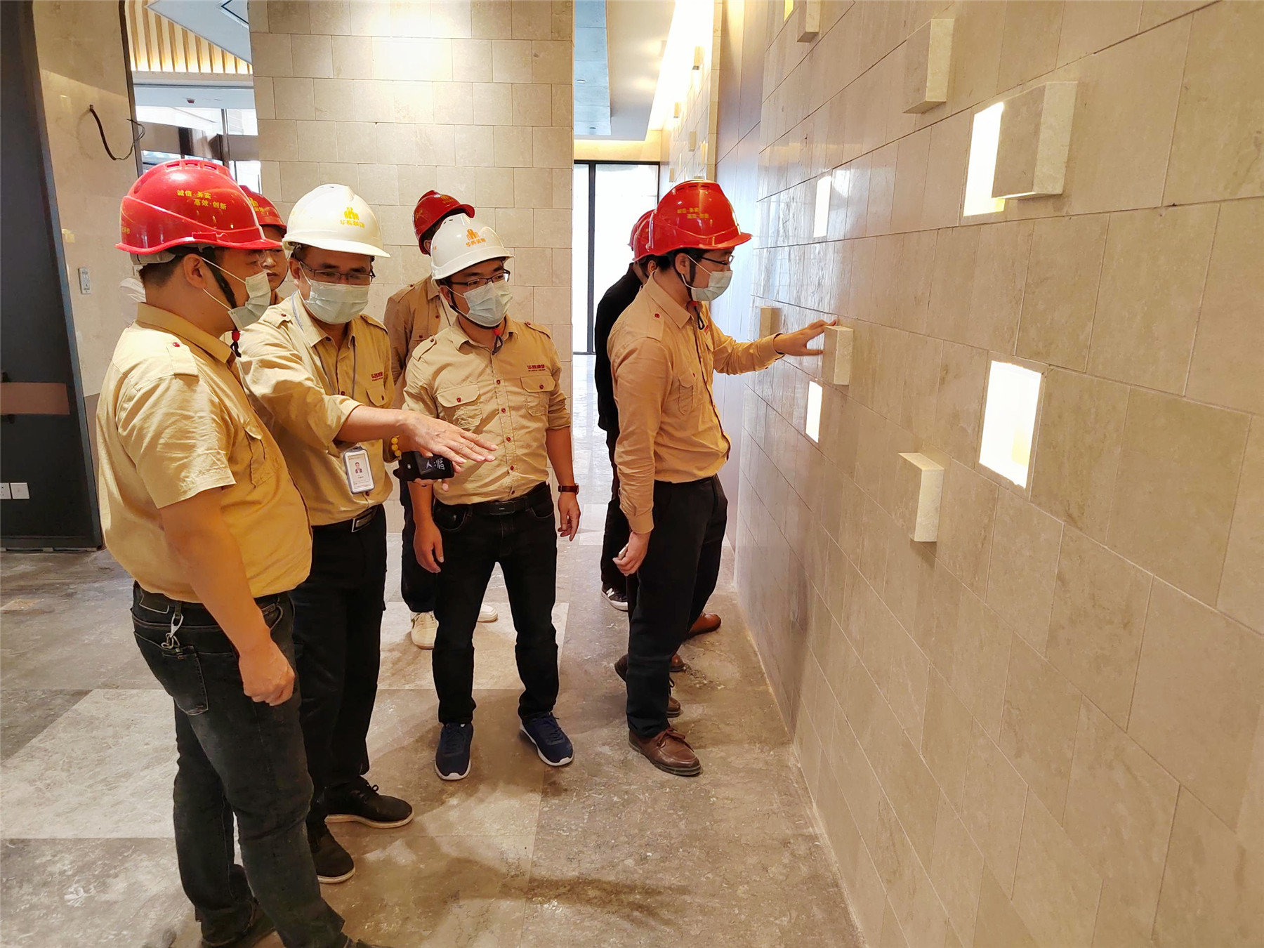全体与会人员实地观摩陆川·温泉九龙山庄装修工程,项目部相关人员详细介绍了施工过程中的重点、难点。本次的观摩会,聚焦项目管理以及施工工艺工法。本项目从前期项目策划、材料的层层把控到施工细节的营造,无不体现华辉人对精工品质的追求。