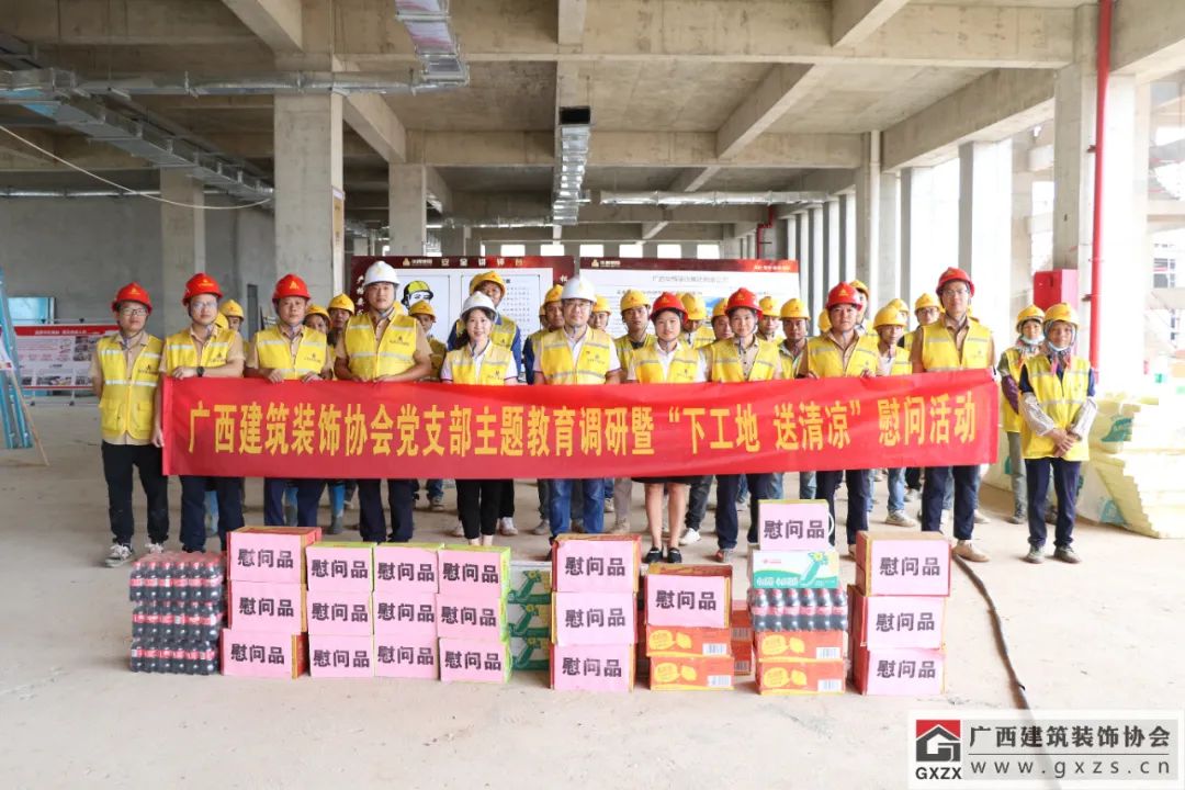 2023年6月8日,广西建筑装饰协会党支部书记黄榆,组织支部党员、入党积极分子、秘书处工作人员一起前往华辉在建项目工地,与华辉党支部共同开展“下工地 送清凉”慰问活动,向华辉一线劳动者送去“清凉慰问品”。