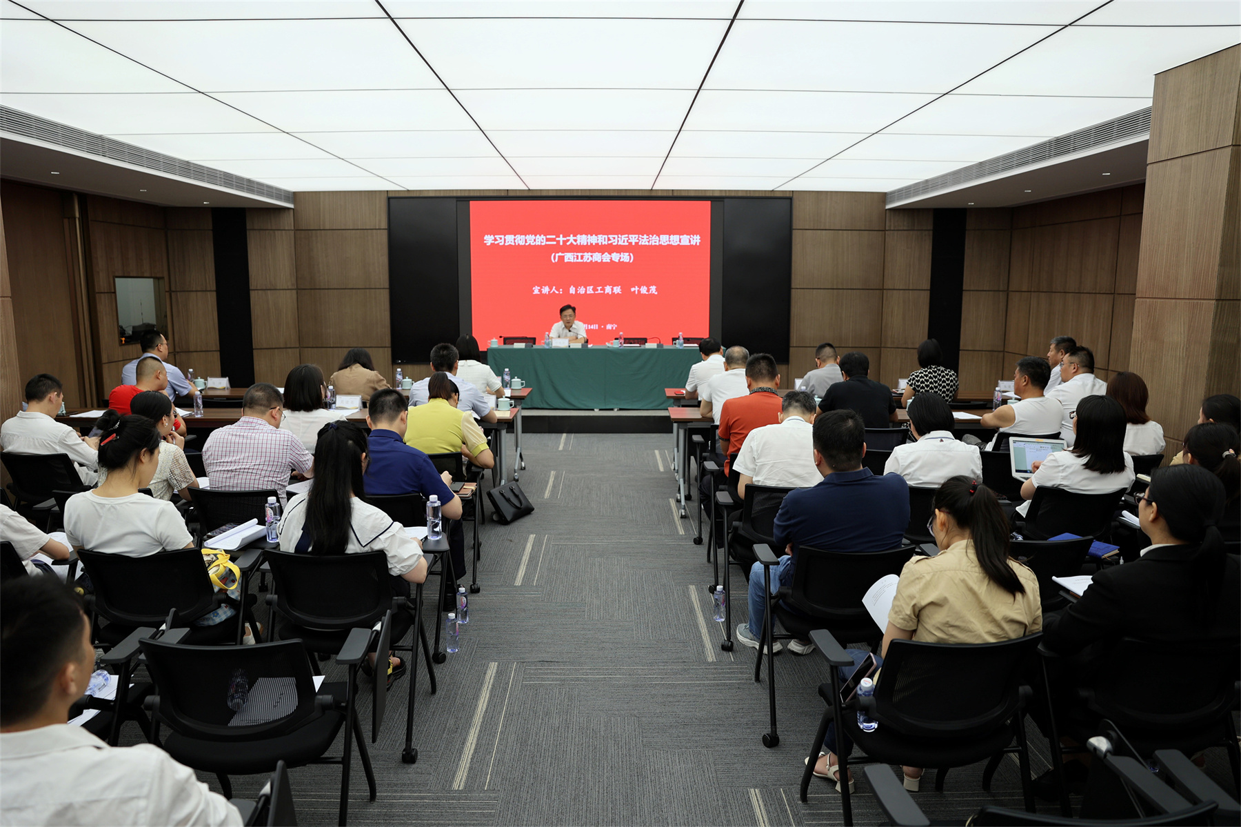 2023年6月14日,自治区工商联2023年“法律进商会”“法律进民营企业”暨防范非法集资宣传活动,在广西华辉装饰集团举行。自治区工商联副主席叶俊茂出席活动并作学习贯彻党的二十大精神和习近平法治思想宣讲。集团董事长杨景忠率公司管理人员及员工代表参加了活动。