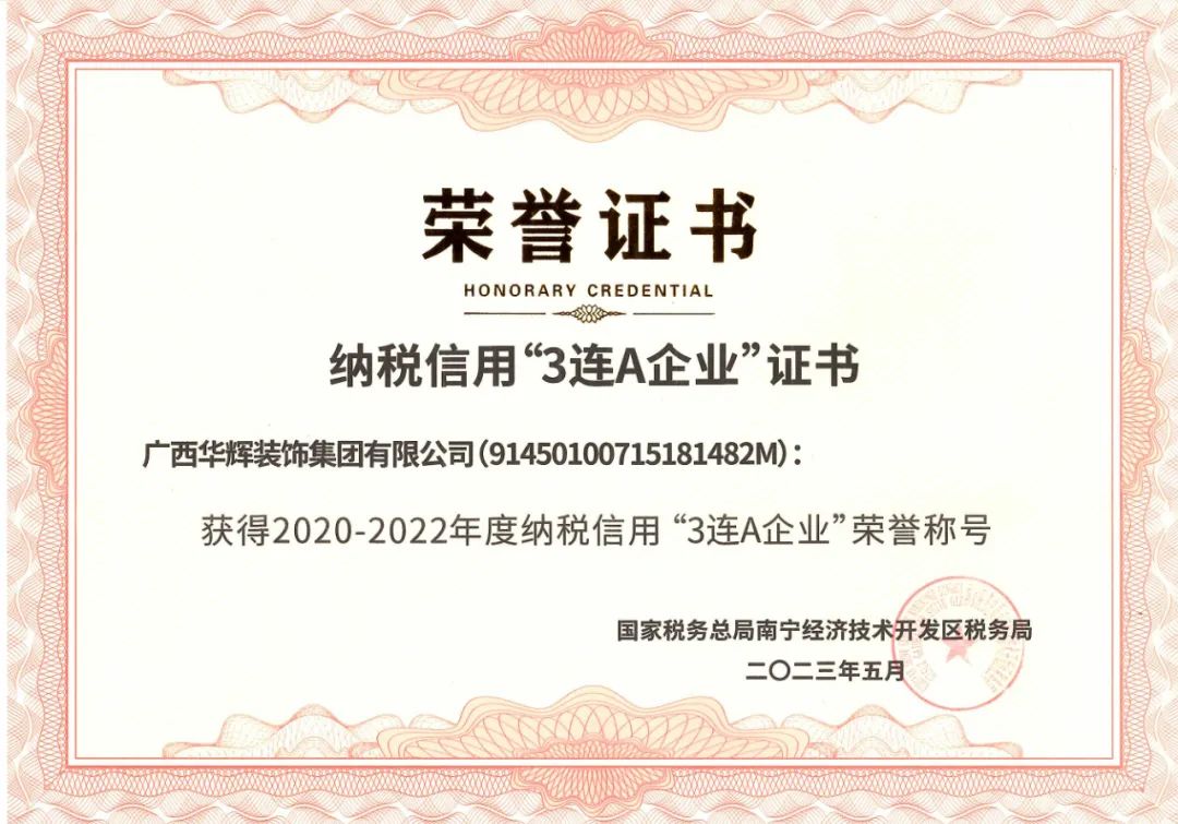 近日,广西华辉装饰集团凭借良好的纳税信誉,获得国家税务总局南宁经济技术开发区税务局2020-2022年度纳税信用“3连A企业”荣誉称号。